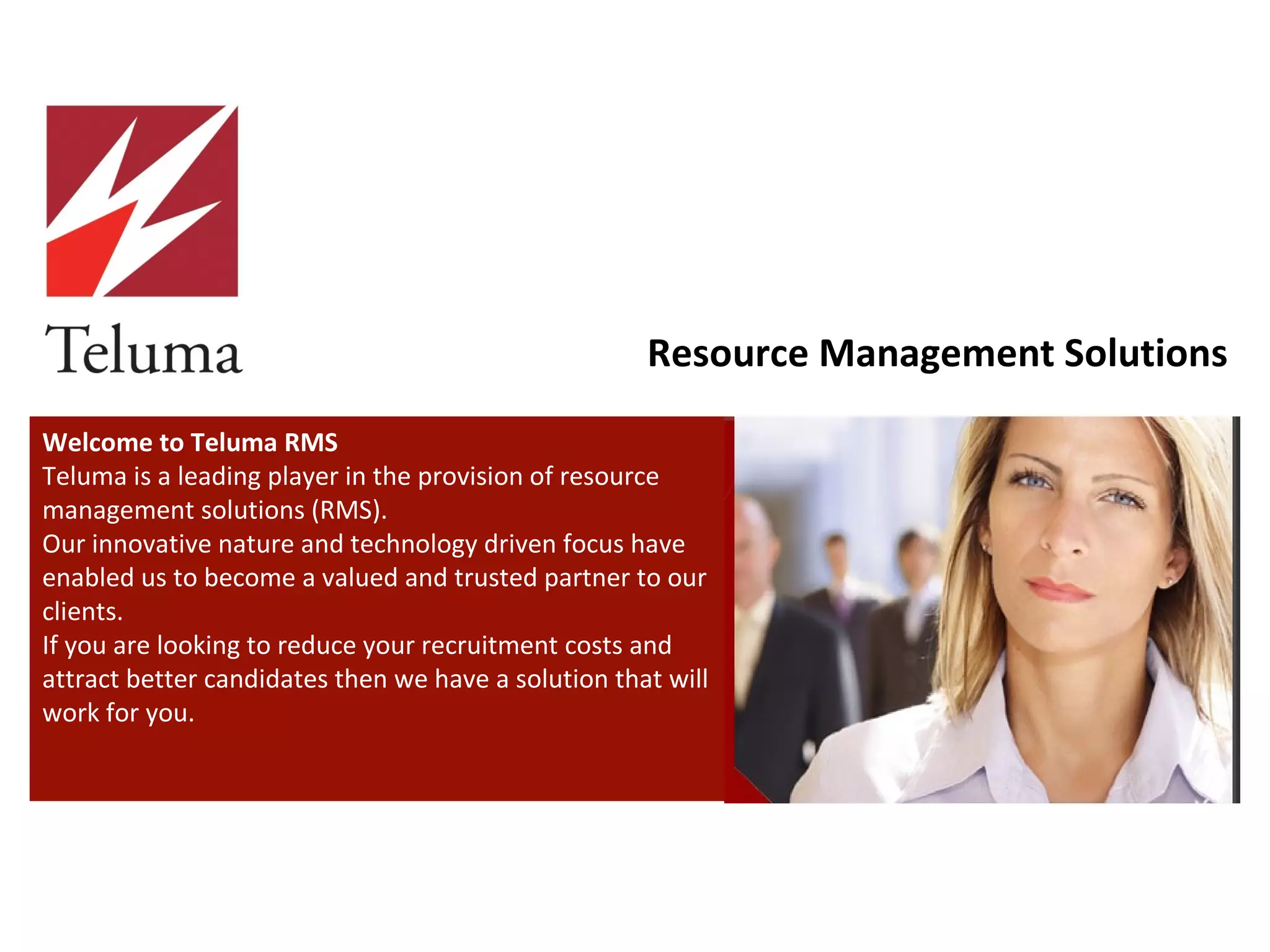 Teluma is a leading provider of resource management solutions that aims to reduce recruitment costs and attract better candidates for its clients through innovative technology-driven solutions. Their resource management solutions and status as a valued partner come from their innovative nature and focus on technology.