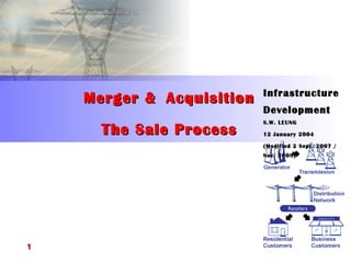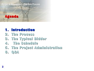 This document discusses the typical process for selling infrastructure development projects, including the sale process, typical bidders, project schedules, and project administration. The sale process generally involves multiple phases from initial documentation through final binding offers and financial close. Bidders form internal teams and engage external advisors to conduct thorough legal, financial, and technical due diligence. Project schedules outline key interim and final due diligence review meetings and milestones. Effective project administration includes selecting advisors, setting up logistics, and managing the due diligence process.