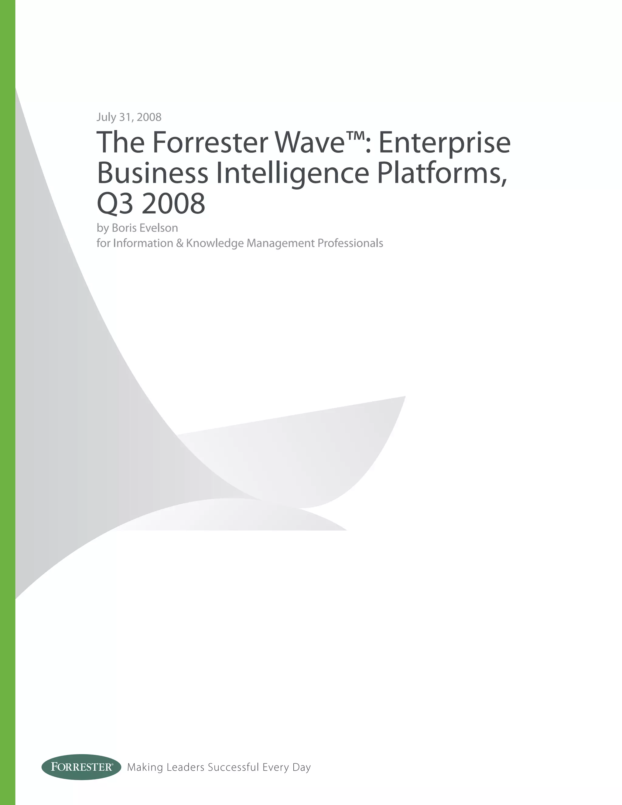The Forrester Wave evaluation for Q3 2008 identifies IBM Cognos and SAP Business Objects as leaders in enterprise business intelligence (BI) platforms, with Oracle and SAS Institute also gaining leadership positions due to their comprehensive functionalities and strategic visions. The assessment reviewed twelve vendors against 151 criteria, highlighting the ongoing evolution in the BI market towards next-generation tools that support deeper insights and user self-service capabilities. New market entrants like Panorama Software and QlikTech are noted for their specific use case strengths, although they lack the breadth of features typical of larger enterprise BI solutions.