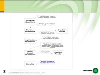 The document summarizes the key concepts of SPIN selling based on the work of Neil Rackham. SPIN selling involves using Situation, Problem, Implication and Need-payoff questions to understand the customer's needs and guide them towards seeing how the seller's solution would meet those needs. It also discusses handling different types of customers, from data-oriented to feeling-oriented, and avoiding objections by focusing on benefits rather than countering objections. The overall goal is to have the customer verbally express their needs in a way that suggests the seller's solution is the answer, before presenting a proposal.