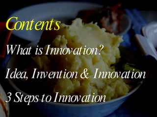 The document discusses the concepts of innovation, ideas, inventions, and the process of innovation. It defines innovation as the profitable implementation of ideas and notes that innovations can increase value for customers and companies. An invention is different from an innovation in that an invention does not yet have commercial value but may in the future. The challenge is to successfully introduce ideas and inventions to the market, which is when they become innovations. The document also outlines three steps to innovation: identify an issue, envision a better approach, and test the new approach with a short-term project.