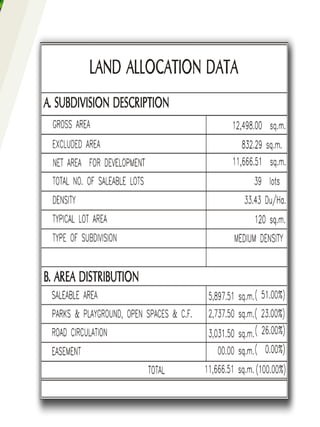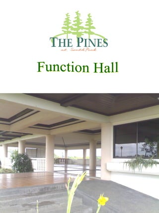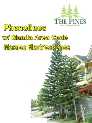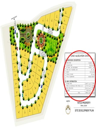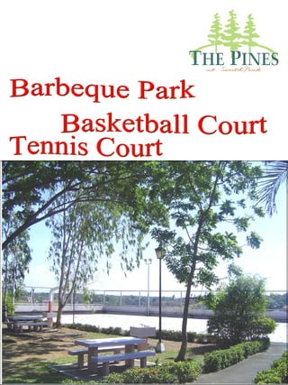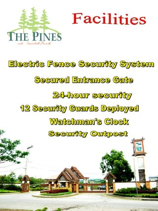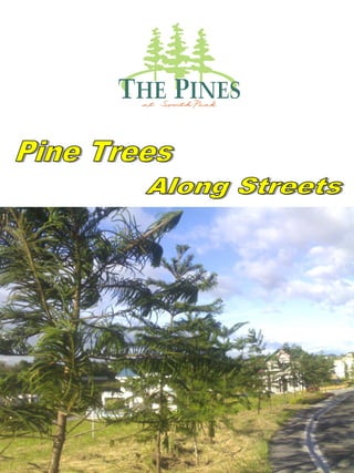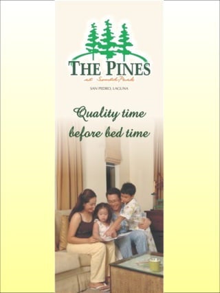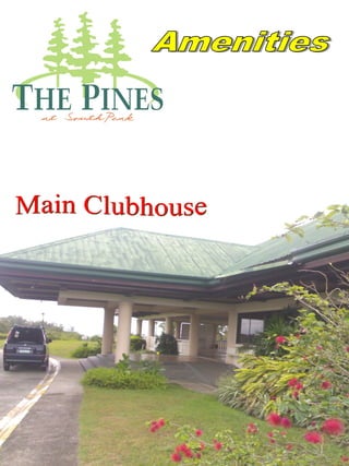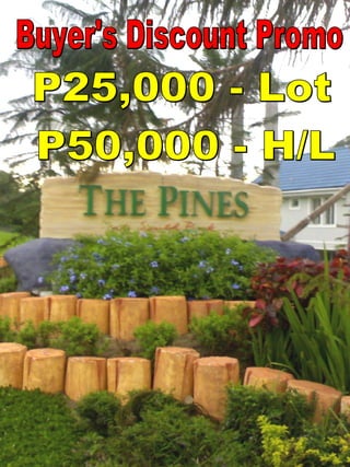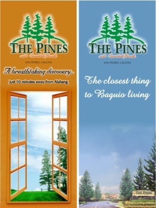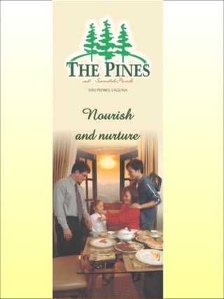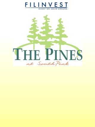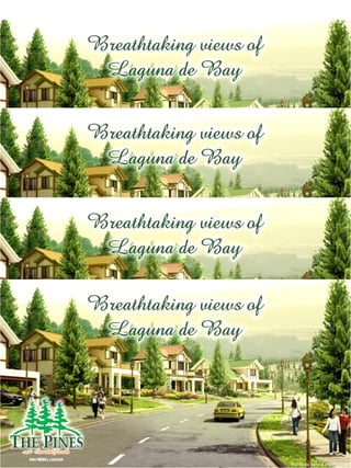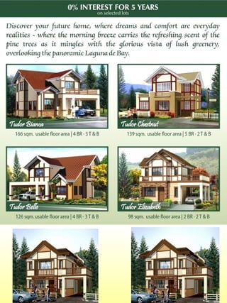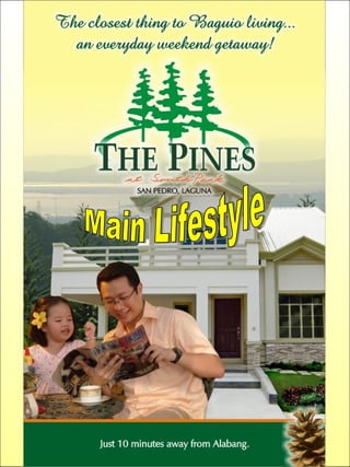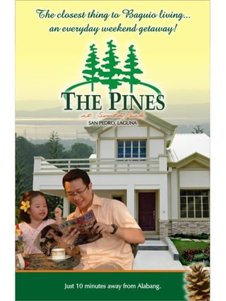 This document describes a residential development located in Laguna near Alabang. It is within 10 minutes of Alabang via the San Pedro Exit and Daang Hari Road. The development offers mountain views of Laguna de Bay, a cool climate, and rolling terrain. It is close to schools like De La Salle Zobel, malls like Alabang Town Center, hospitals like Asian Hospital, and office parks. The development was launched in 2007 and has 292 units ranging from 132 to 1,000 square meters. It has some ready for occupancy units as well as American contemporary house models ranging from 150 to 162 square meters priced between 4 to 5.3 million pesos. Residential lots are priced from