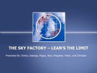 The document discusses implementing lean processes at The Sky Factory to improve efficiency and reduce costs. It describes the current state as having suboptimal processes and layout. Plans are outlined to map current processes, identify lean metrics, make improvements through kaizen events, and conduct ongoing analysis of lean initiatives. Cost-benefit analysis of two areas found lean could increase margins by over $100,000 annually through reduced labor and transportation costs. Continued lean implementation is projected to provide compounding benefits through increased productivity and revenues.