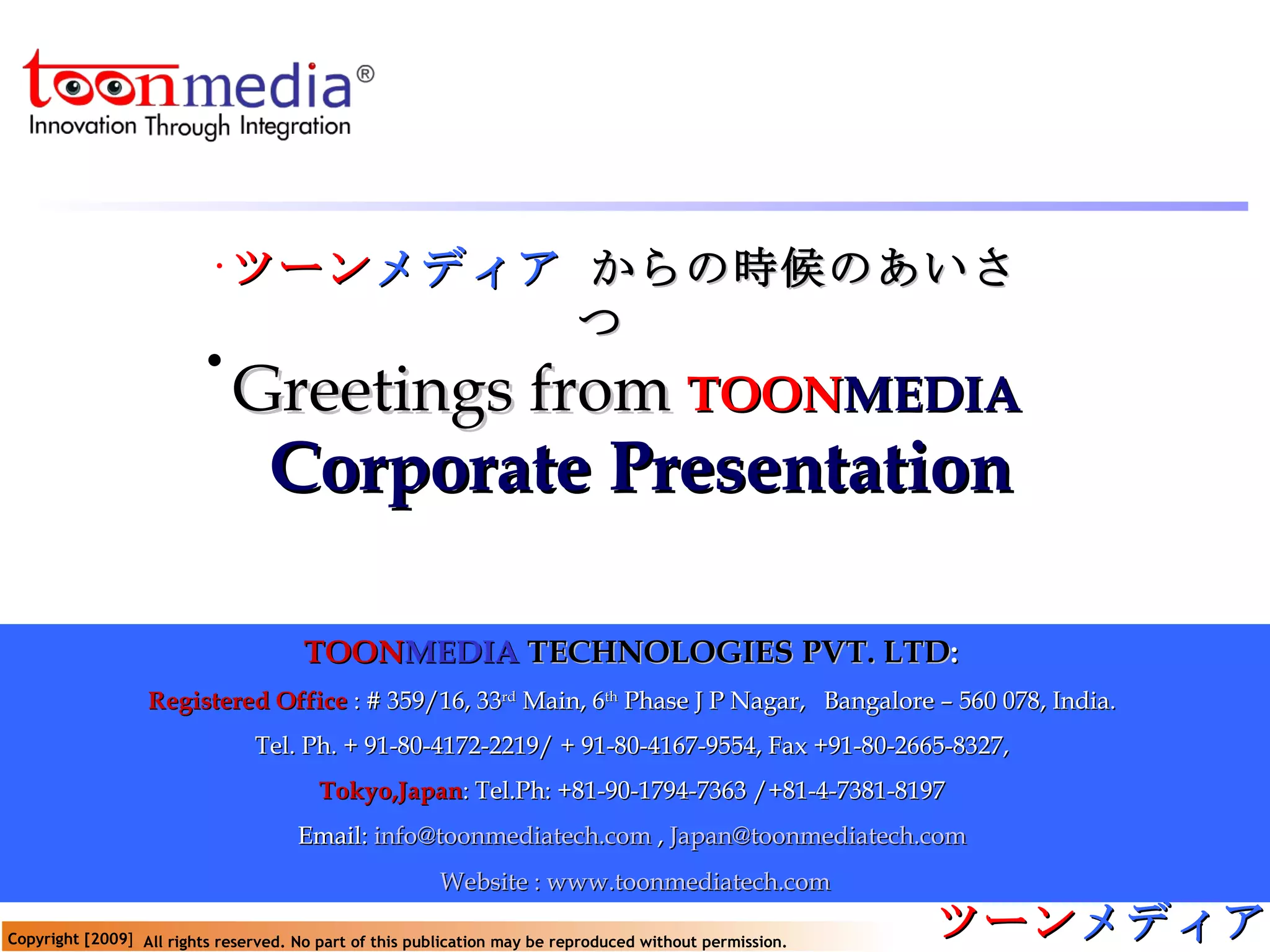 Toon Media Technologies is an animation, IT and HR outsourcing company based in Bangalore, India with offices in Tokyo, Japan. The company was founded in 2007 and provides services such as animation content development, software development, IT recruitment, technical translations and staffing solutions. It aims to become a leader in the linguistic industry globally and has worked with major clients from Japan, US, UK and other countries.