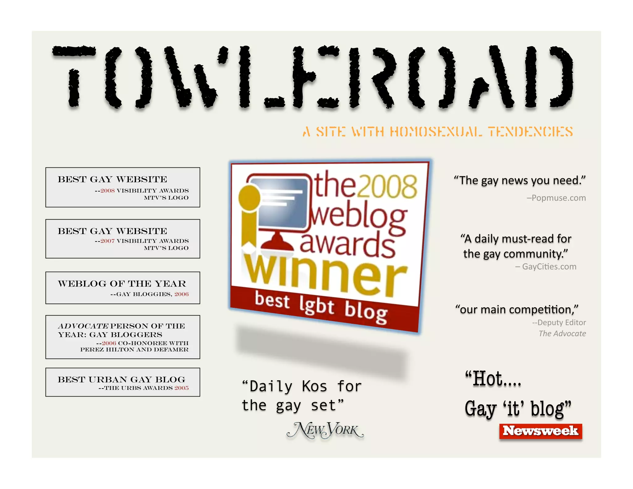 The document highlights various awards and recognitions received by gay websites and bloggers, including multiple Visibility Awards from MTV's Logo and the Gay Bloggies. It features a notable statement from Jason Bartlett, a prominent openly gay elected official, reflecting on the impact of being featured on the blog Towleroad. Overall, it emphasizes the importance of visibility and representation in the LGBTQ+ community.