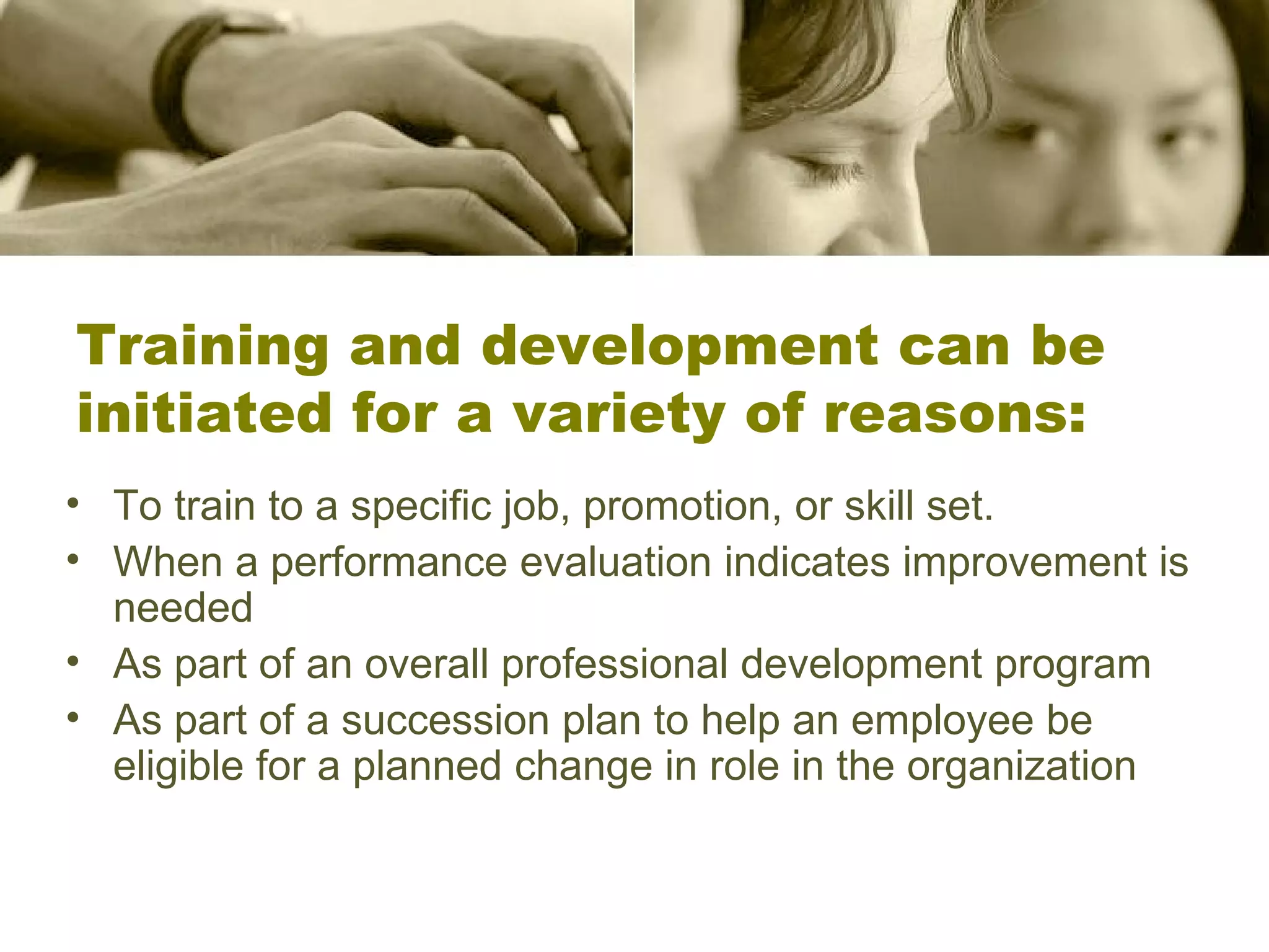 Employee training and development can benefit both employees and employers in several ways. It can increase job satisfaction, motivation, and productivity among employees. It can also increase efficiencies, financial gains, innovation, and reduce turnover. Training topics include communication, computer skills, customer service, diversity, ethics, and health and safety. Training is available in personal and professional development areas, and in competencies like leadership, teamwork, and customer service. While currently only one training is mandatory per year, making more training mandatory could help ensure staff are prepared for the future and do not fail in their roles, though it may face union objections.