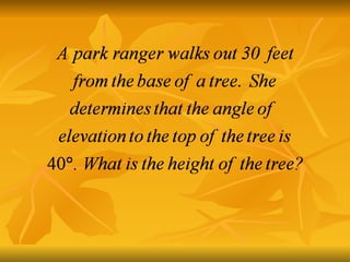 The document discusses trigonometric functions and right triangles. It defines the six trigonometric functions as ratios between pairs of sides in a right triangle. The first three functions are sine, cosine, and tangent, which relate the opposite, adjacent, and hypotenuse sides to a given angle. The other three are the reciprocals of the first three and complete the set of basic trigonometric functions.
