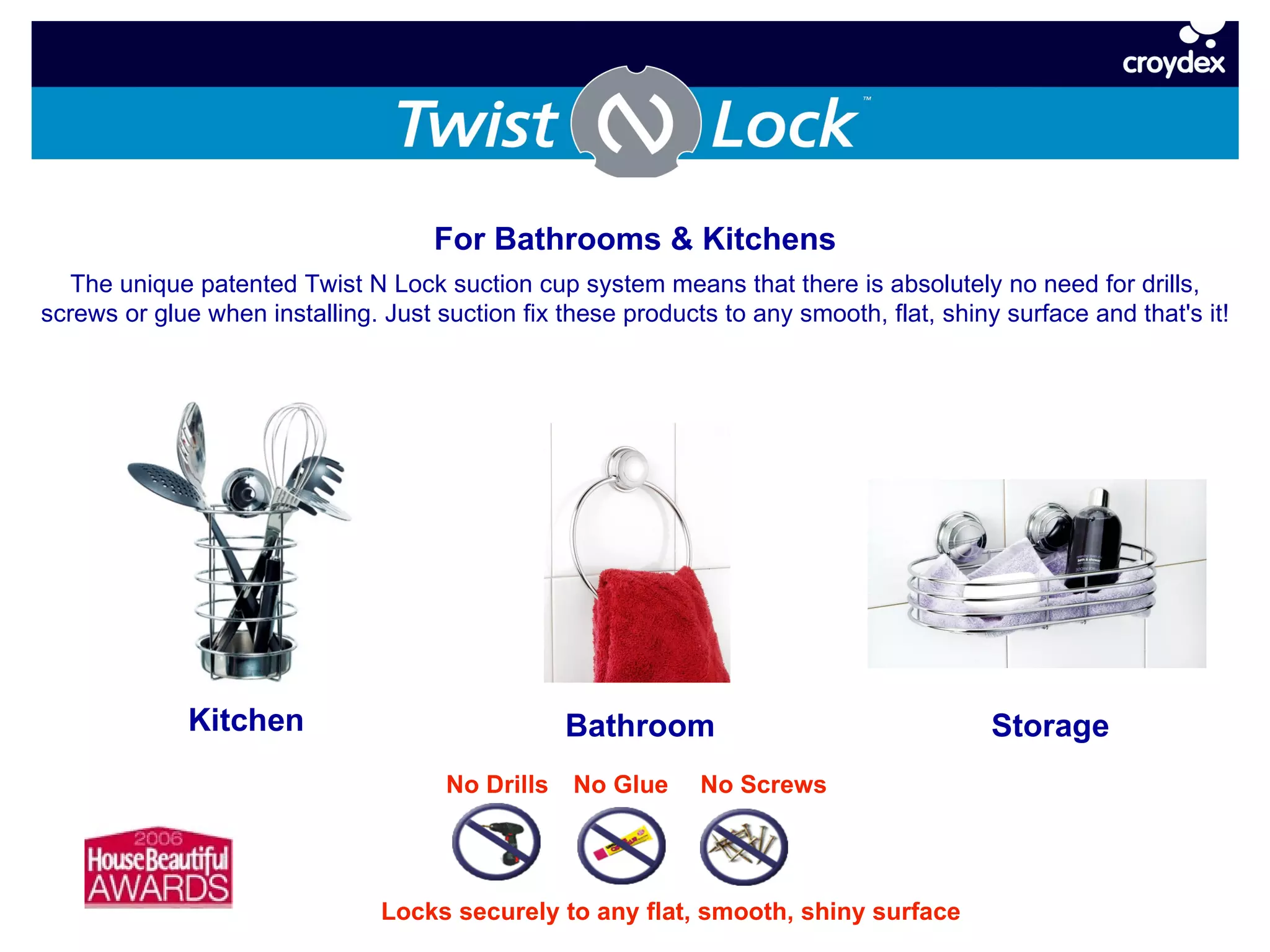 The document describes a suction cup storage and organization system called Twist N Lock. It can be installed without tools in minutes by twisting a decorative cap to create a vacuum seal between the suction cup and a smooth surface. A variety of storage products are available for bathrooms and kitchens. Instructions explain how to clean the surface, apply the suction cup, and twist the cap to securely install the storage item.