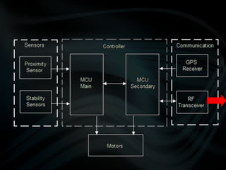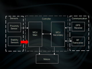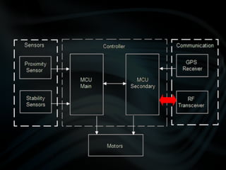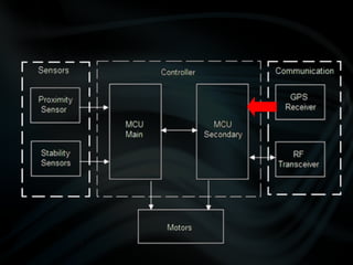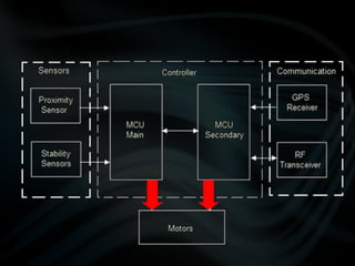 The document discusses the design and development of quadcopter unmanned aerial vehicles (UAVs). It describes the prototypes created, including improvements made to reduce weight and increase lift. Sensors and controllers are discussed, including sensors for position, proximity, and navigation. The final prototype achieved stable hovering with a weight of 43 grams and incorporated an inertial measurement unit, ultrasonic sensors, GPS, and radio frequency transmission for control and data transmission.
