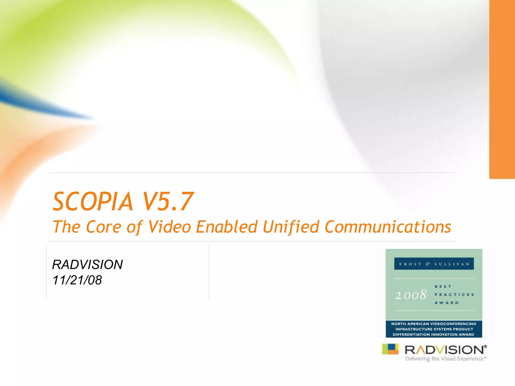 The document discusses RADVISION's SCOPIA unified communications platform and its role at the core of video-enabled unified communications. SCOPIA V5.7 enhancements focus on improved performance, quality, and ease of use for the SCOPIA Desktop client. RADVISION provides a competitive edge over other solutions through its integrated desktop client, recording and content management capabilities, and support for major UC partnerships.