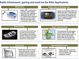 The document discusses the growth of mobile value-added services (MVAS) in India, noting that the country has the second largest mobile subscriber base in the world and expects substantial growth driven by an increasing rural subscriber base, innovative services, and regulatory support. MVAS contributes approximately 9% of operators' revenue, with projections to rise to 12% by mid-2010, while opportunities in rural areas aim to meet connectivity and entertainment needs through various applications. The future of MVAS is anticipated to expand significantly with the introduction of 3G technology and new applications such as m-commerce and multimedia services.