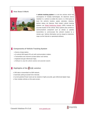 Gmantis Solutions Pvt Ltd is an Indian company that provides vehicle tracking systems. A vehicle tracking system uses GPS and communication technologies to track a vehicle's location, speed, and other data. The system includes in-vehicle tracking units, servers, transmitters, receivers, and software to view vehicle positions on digital maps. Gmantis' solution transmits GPS data via cellular networks and allows users to view current positions, travel routes, and generate reports on multiple vehicles.