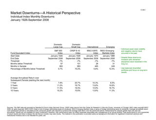 The document discusses short-term volatility and long-term returns of the S&P 500 index over various time periods from 1999 to 2008. It notes that while the S&P 500 had an annual return of 21% in 1999, it experienced negative monthly returns in 5 out of 12 months that year. Similarly, other asset class indexes like small-cap domestic stocks and international stocks routinely experienced negative monthly returns, but investors were still rewarded with strong long-term returns by remaining disciplined and diversified.