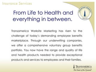 Transamerica Worksite Marketing offers a wide range of voluntary group benefits including life, health, and critical illness insurance, with options for guaranteed issue and simplified underwriting based on group size. Their products also encompass supplemental insurance for accidents, disability, dental, vision, and legal protection, alongside an electronic enrollment system for easy administration. Comprehensive coverage options are tailored to meet diverse employee needs and sustainable participation requirements for groups of varying sizes.