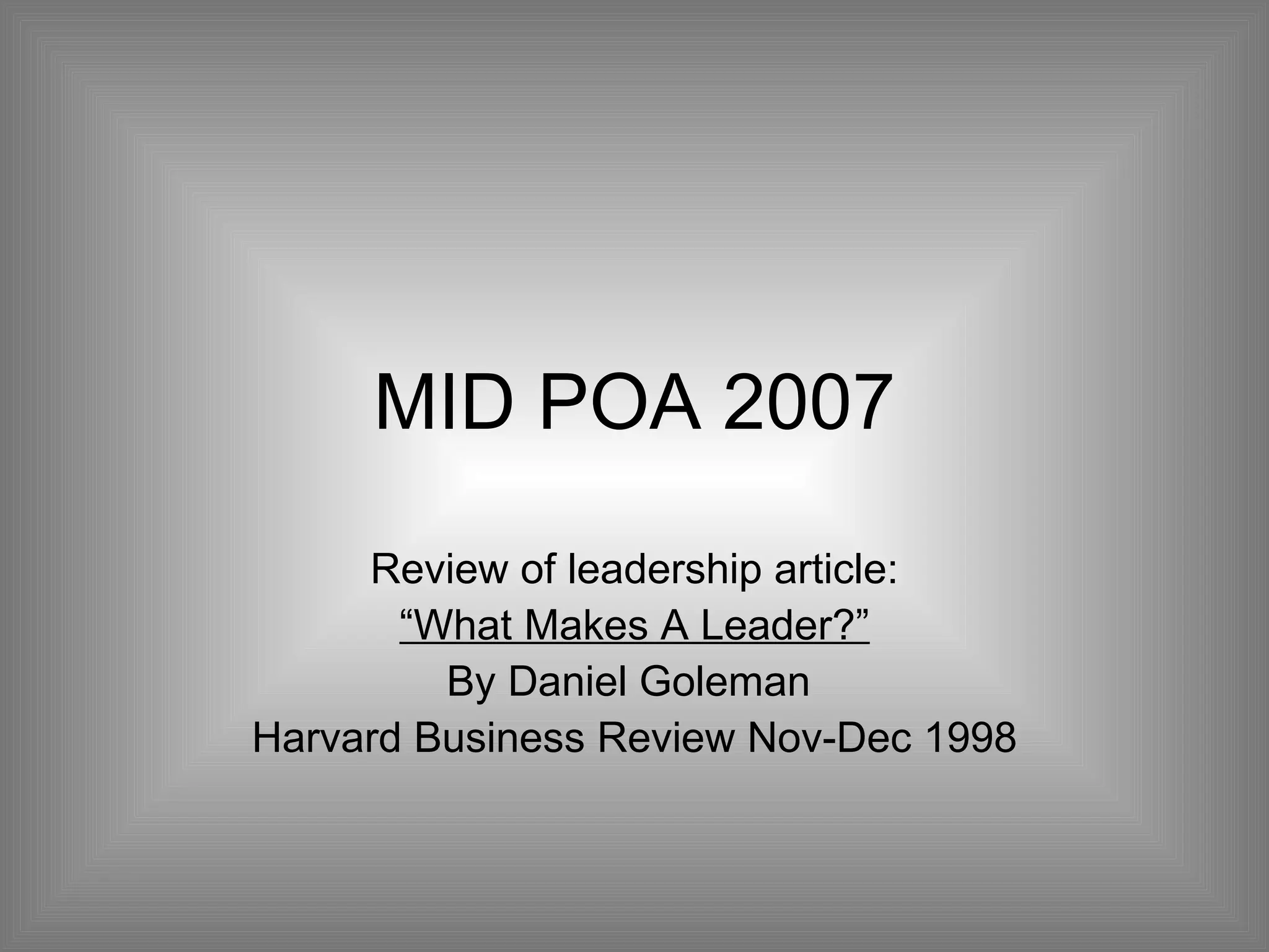 The document reviews Daniel Goleman's article on leadership from the Harvard Business Review, emphasizing the importance of emotional intelligence in effective leadership. It outlines five key components: self-awareness, self-regulation, motivation, empathy, and social skills, highlighting their significance in personal leadership development. It concludes by affirming that emotional intelligence can be learned and includes a group activity to identify areas for improvement among team members.