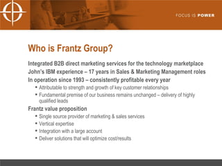 The Frantz Group is a marketing services company that helps technology companies with marketing and sales. They identify target markets, develop marketing strategies and campaigns, and cultivate qualified leads. Their services include direct mail, email marketing, web development, events, lead qualification, telesales, and customer service to close deals and ensure lasting customer relationships.