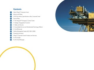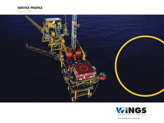 Wingsâ„¢ Corporate Travel provides travel management services with a specialization in the oil and gas industry. It has several pillars of service including its 24/7 emergency contact center, strategic global locations, focus on safety and security, consolidated technology platform, and efforts to reduce costs. Wingsâ„¢ aims to provide innovative customized solutions through pioneering new technologies and products to help travelers and travel managers be more efficient, secure and environmentally responsible.