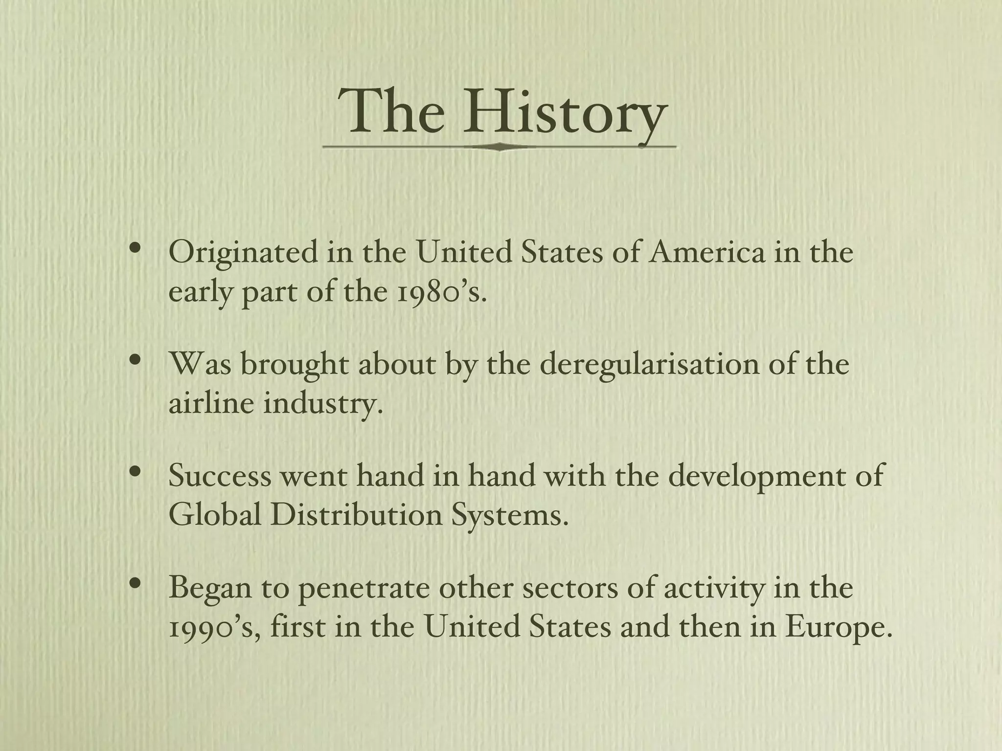 Yield management originated in the 1980s in the U.S. due to airline industry deregulation and has since expanded to other sectors. It is a strategy aimed at maximizing revenue through real-time demand forecasting and by offering services at optimal times and prices. The hotel industry specifically seeks to balance occupancy and average daily rates while accommodating various customer sensitivities to pricing.