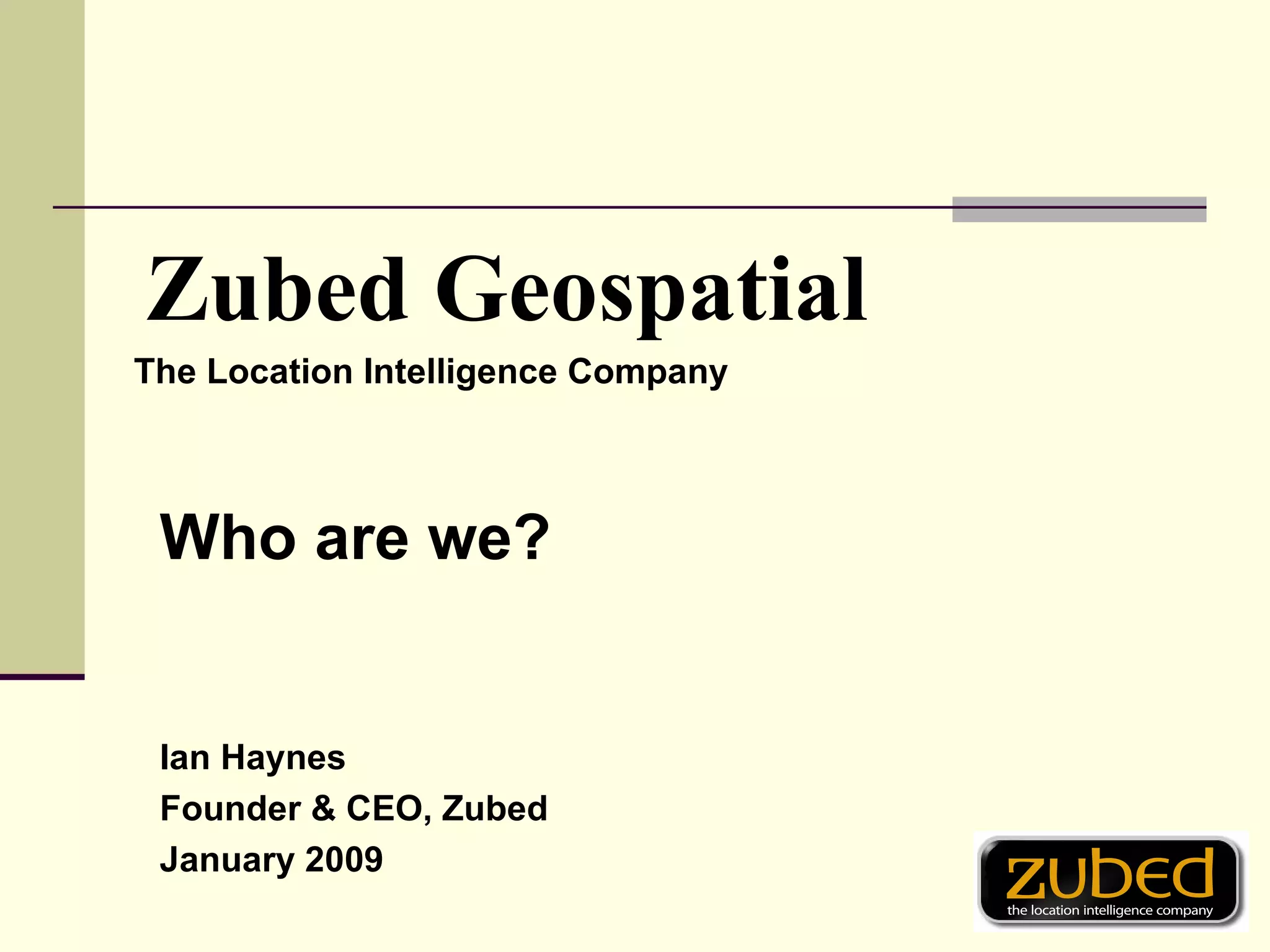 Zubed Geospatial is a web-based mapping company that creates customized interactive maps for organizations with large amounts of data. Zubed applies mapping at the street and global level to allow executives to view, extract, and manipulate their data directly through the Zubed interface. Zubed removes the complexity and cost of traditional GIS systems and makes geographic analysis of data available to everyone. Some example applications include sales and territory management, retail store location planning, and risk analysis. Zubed functionality includes displaying maps from Google, Yahoo, and Microsoft, as well as geocoding, point markers, heatmaps, polygon plotting, and data integration with SAP and Oracle. Zubed is a cloud-based