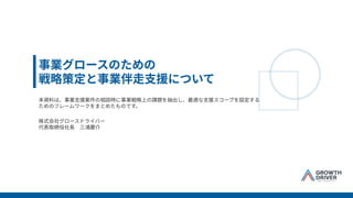 株式会社グロースドライバーの戦略策定および伴走支援に関する紹介資料です。スタートアップや急成長企業が直面する戦略上の課題やその原因を、事例を交えた解決策とともに説明しています。マーケティング課題を抱える企業は多いですが、実際には「集客」といった小さな課題ではなく、根本的な現状分析の不足と、それに起因するWHO /WHATの深堀り不足が要因であることがほとんどです。本資料は経営幹部むけであり、やや難解な内容を含んでいますが、ほとんどの事業の成長確度を変えるために有効かつ実績のあるフレームワークになっています。