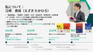 RULE DESIGN 東京大学工学系研究科航空宇宙工学専攻 JST/さきがけ研究員 スタンフォード大学/客員研究員 東大先端研先端物流科学寄付研究部門/特任講師 株式会社infonerv/取締役 NII/特別研究員 ルートエフデータム株式会社/エグゼクティブアドバイザー • • • • • 日本学術振興会/特別研究員