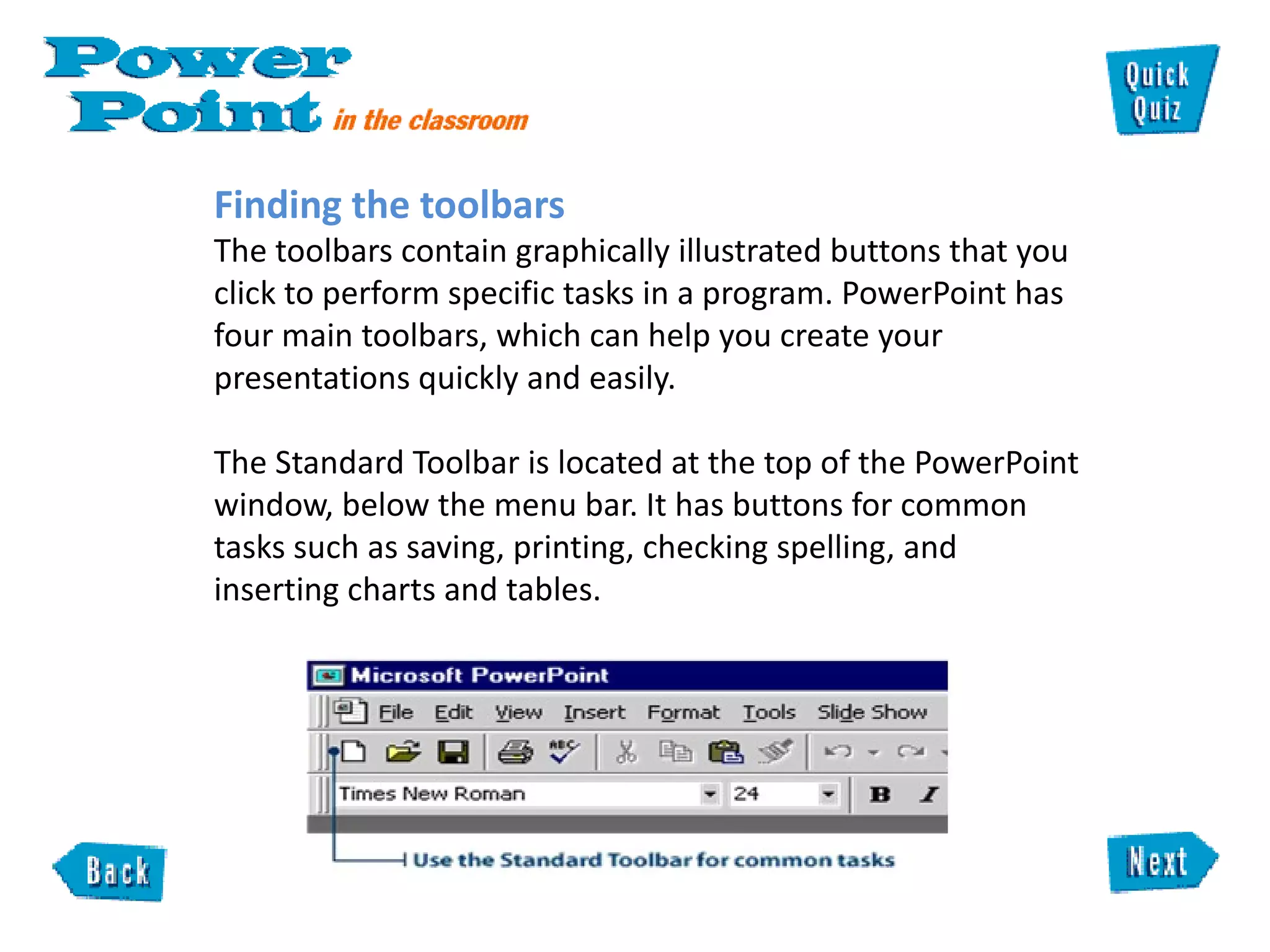 The document introduces PowerPoint toolbars and other essential concepts. It discusses the four main toolbars - Standard, Formatting, Drawing, and Common Tasks. It describes how to move, dock, add, and remove toolbars. Key terms like slide, presentation, object, and transition are defined. The document recommends teaching PowerPoint basics like toolbars and vocabulary to students in a systematic way before introducing more advanced features.