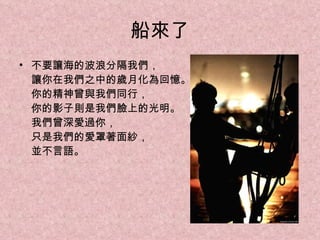 船來了 不要讓海的波浪分隔我們, 讓你在我們之中的歲月化為回憶。