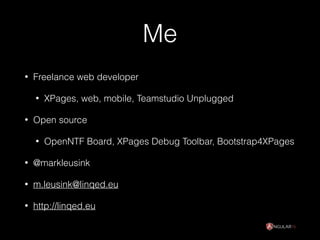This document introduces AngularJS as a front-end web application framework that enhances client-side programming, contrasting its architecture with server-side XPages. It discusses the development process, tools, and provides setup instructions for demos using Domino data services. The document highlights the significance of AngularJS in modern web development and mobile hybrid applications.