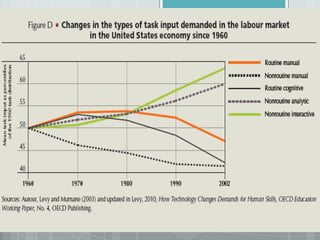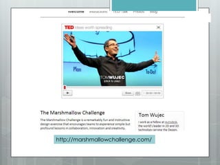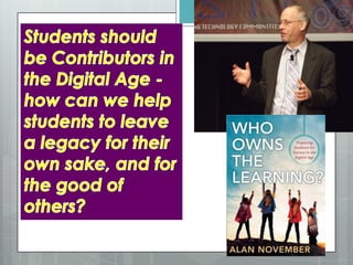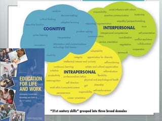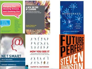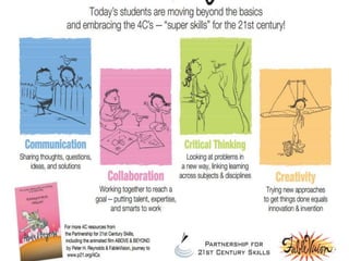 The document discusses skills needed for the 21st century, including critical thinking, creativity, collaboration, growth mindset, determination, self-regulation, compassion, curiosity, digital citizenship, communication, play, experimentation, grit, information literacy, and connected learning. It emphasizes the importance of developing these skills through play, iteration, and connecting learning both inside and outside the classroom through collaboration with others around the world. Students need to learn attention, participation, knowledge production, and "crap detection" to effectively engage with online information.