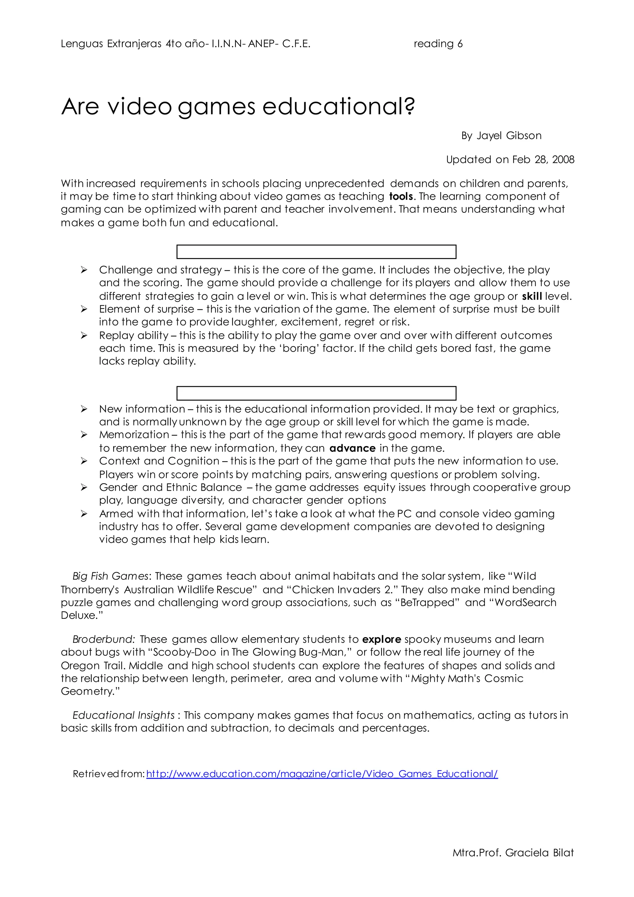 This document discusses whether video games can be educational. It outlines several key elements that make a video game both fun and educational, including challenge/strategy, element of surprise, replayability, inclusion of new information, memorization, applying knowledge through context and cognition, and addressing gender and ethnic balance. It then provides examples of several game development companies that design video games to help kids learn, such as Big Fish Games, Broderbund, and Educational Insights, which create games around subjects like animal habitats, puzzles, word associations, history, and mathematics.
