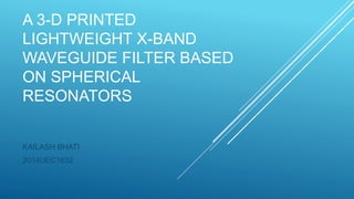 The document discusses the design and fabrication of an X-band waveguide bandpass filter based on spherical resonators using 3D printing technology. It highlights the benefits of spherical resonators, such as a higher unloaded quality factor and lighter weight compared to traditional filters, while also addressing challenges related to higher order modes. The proposed filter topology enhances out-of-band rejection, achieves good dimensional accuracy, and demonstrates a favorable frequency response consistent with its design.
