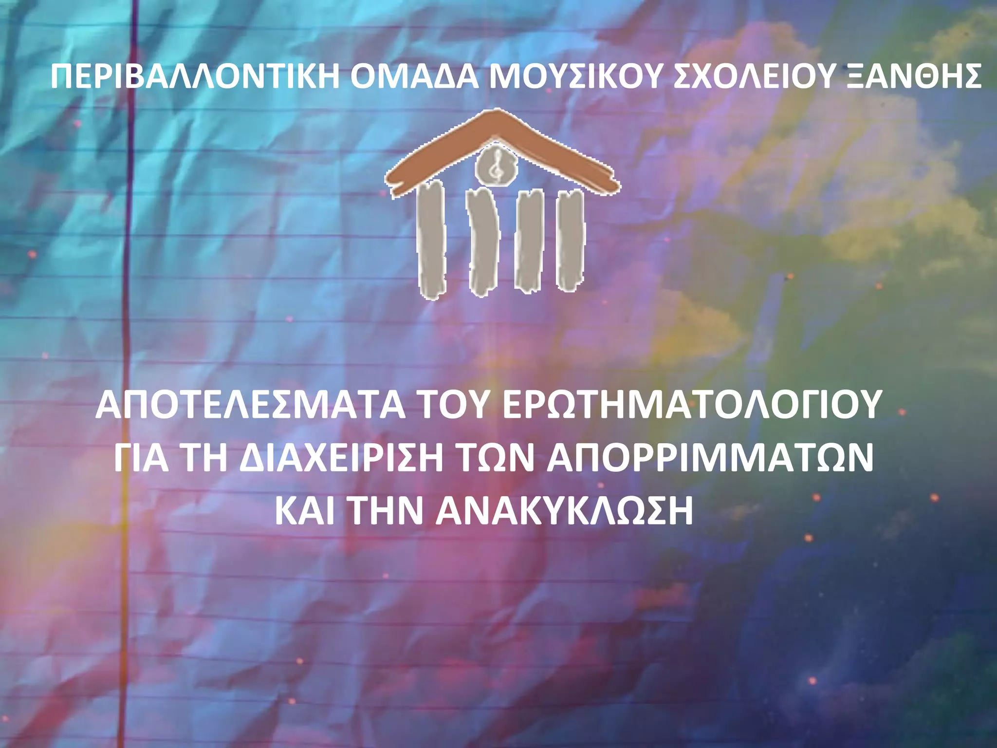 Σε αυτήν την παρουσίαση δίνονται τα αποτελέσματα του ερωτηματολογίου που δημιούργησε η Περιβαλλοντική Ομάδα του Μουσικού Σχολείου Ξάνθης με σκοπό τη διερεύνηση των αντιλήψεων των μαθητών για τη διαχείριση των απορριμμάτων και την ανακύκλωση.