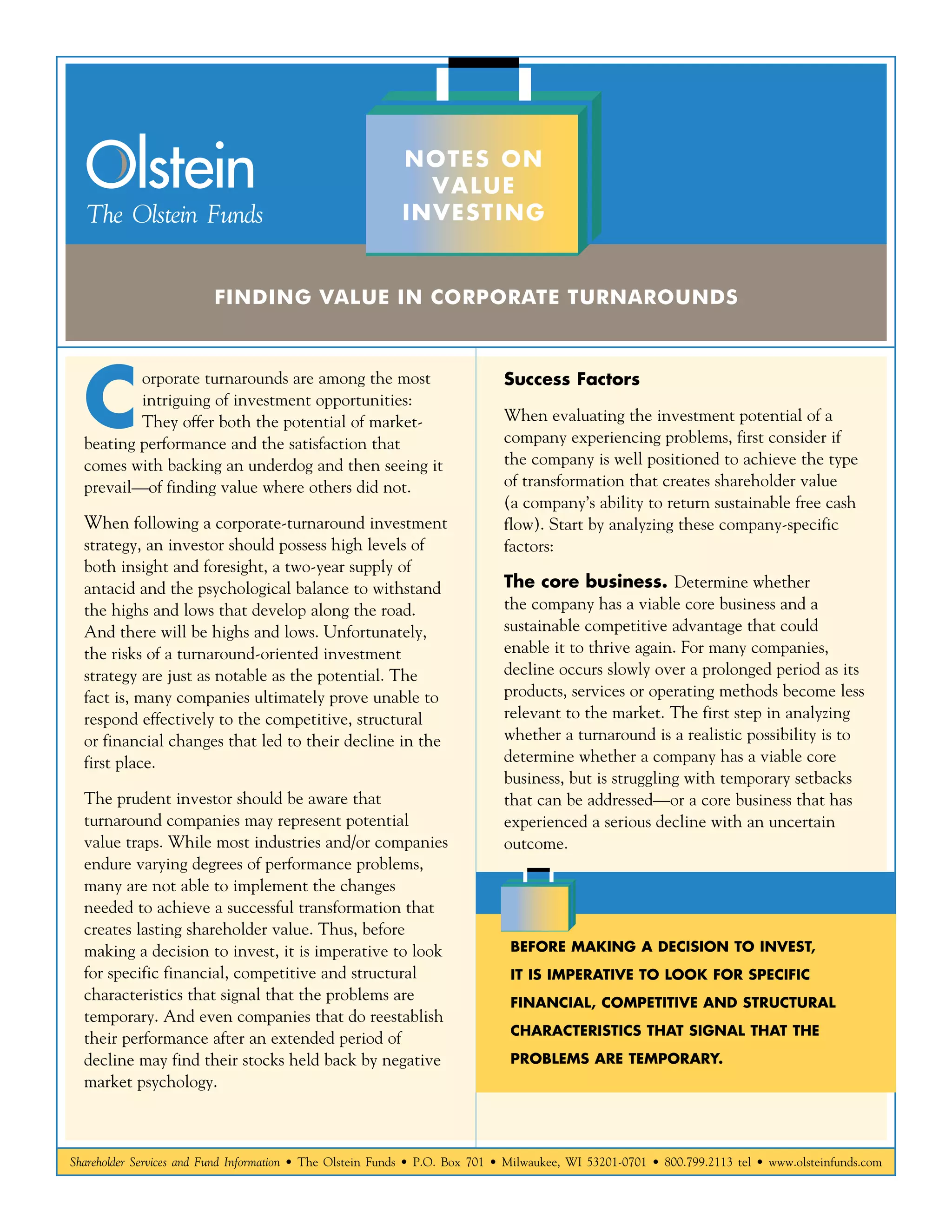 The document discusses factors to consider when evaluating potential corporate turnaround investments. It outlines several key characteristics that indicate a company is well-positioned for a successful turnaround: having a viable core business, a healthy balance sheet, clean accounting practices, an understanding of what caused past failures, and a capable management team focused on improving free cash flow. However, turnarounds also carry risks, and the document describes some red flags to watch out for, such as a lack of transparency, ineffective management, failed prior turnaround attempts, insufficient resources, and weak core products/services. Overall, corporate turnarounds require patience, as it can take over a year for strategic actions to produce positive results.
