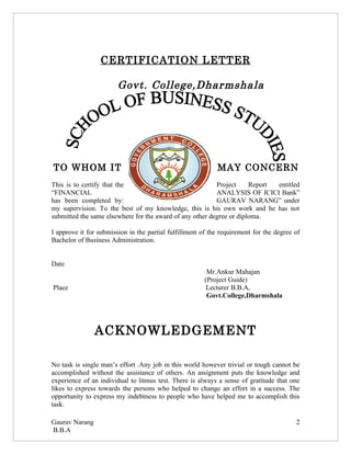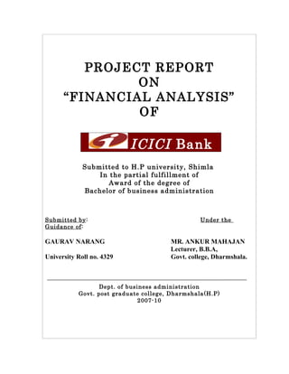 The document is a project report on the financial analysis of ICICI Bank submitted to HP University in Shimla, India. It includes sections on the introduction of banking in India, a profile of ICICI Bank, the research methodology, and a financial analysis of ICICI Bank. The report was submitted by Gaurav Narang under the guidance of his project guide Mr. Ankur Mahajan to partially fulfill the requirements for a Bachelor of Business Administration degree.