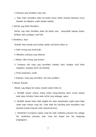 1. Dokumen tersebut membahas beberapa topik muamalah seperti wakalah, sulhu, daman, dan kafalah. Wakalah adalah penyerahan tugas kepada orang lain, sulhu adalah perdamaian antara dua pihak yang bersengketa, daman adalah menanggung utang orang lain, sedangkan kafalah adalah tanggungan badan untuk menunaikan kewajiban orang lain.