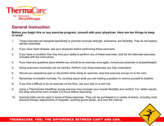 The document describes abdominal stretching and strengthening exercises called ThermaKinetics that are recommended to alleviate menstrual cramps. It provides instructions for exercises like the cat stretch, lower trunk rotation, and abdominal curl up. Performing these low-impact, non-aerobic exercises in combination with ThermaCare HeatPatches is suggested for maximum benefit in easing menstrual pain. Safety instructions are also provided to ensure the correct form is followed.