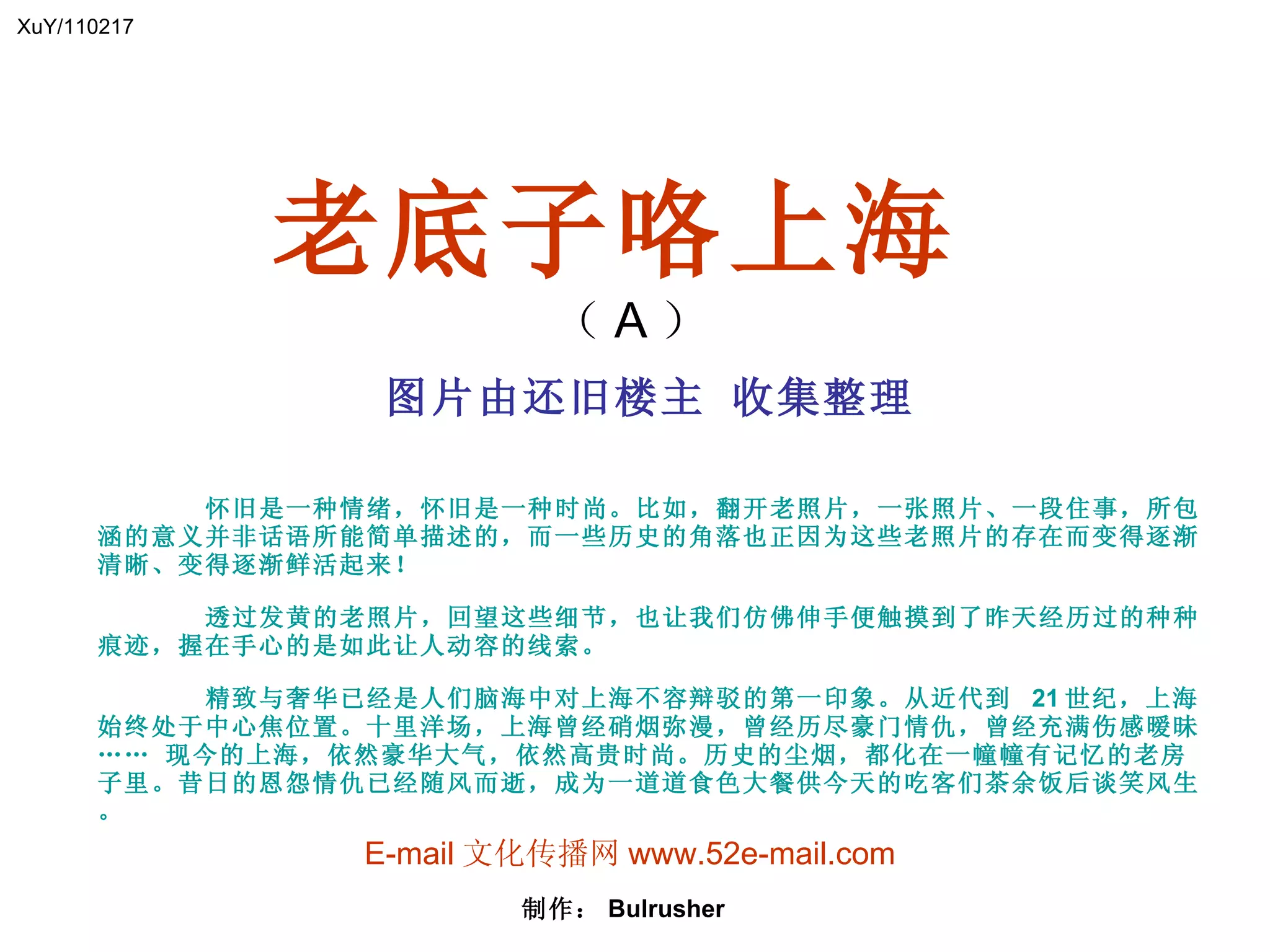 本文件探讨了上海的历史与怀旧情感,利用老照片重现了这座城市的过去,包括其古老的建筑和街道。文章描述了上海从近代到21世纪的变迁,如何在保持奢华的同时,承载着深厚的历史记忆。通过回顾这些历史细节,读者能够更深入地理解上海的文化与情感。