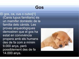 Gos El gos,ca, cus o cutxo[1] (Canis lupus familiaris) és un mamífer domèstic de la família dels cànids. Les proves arqueològiques demostren que el gos ha estat en convivència propera amb els humans des de fa com a mínim 9.000 anys, però possiblement des de fa 14.000 anys.