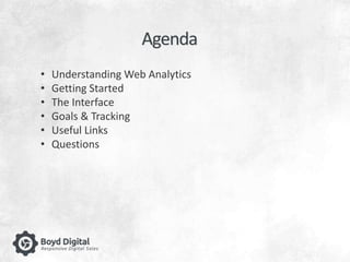 The document provides an overview of web analytics, focusing on how to use Google Analytics to measure and optimize web usage. It covers essential concepts such as setting goals, tracking user interactions, and understanding traffic sources, along with a step-by-step guide on getting started with the platform. Additionally, it highlights the importance of analyzing visitor data to enhance marketing campaigns and user engagement.
