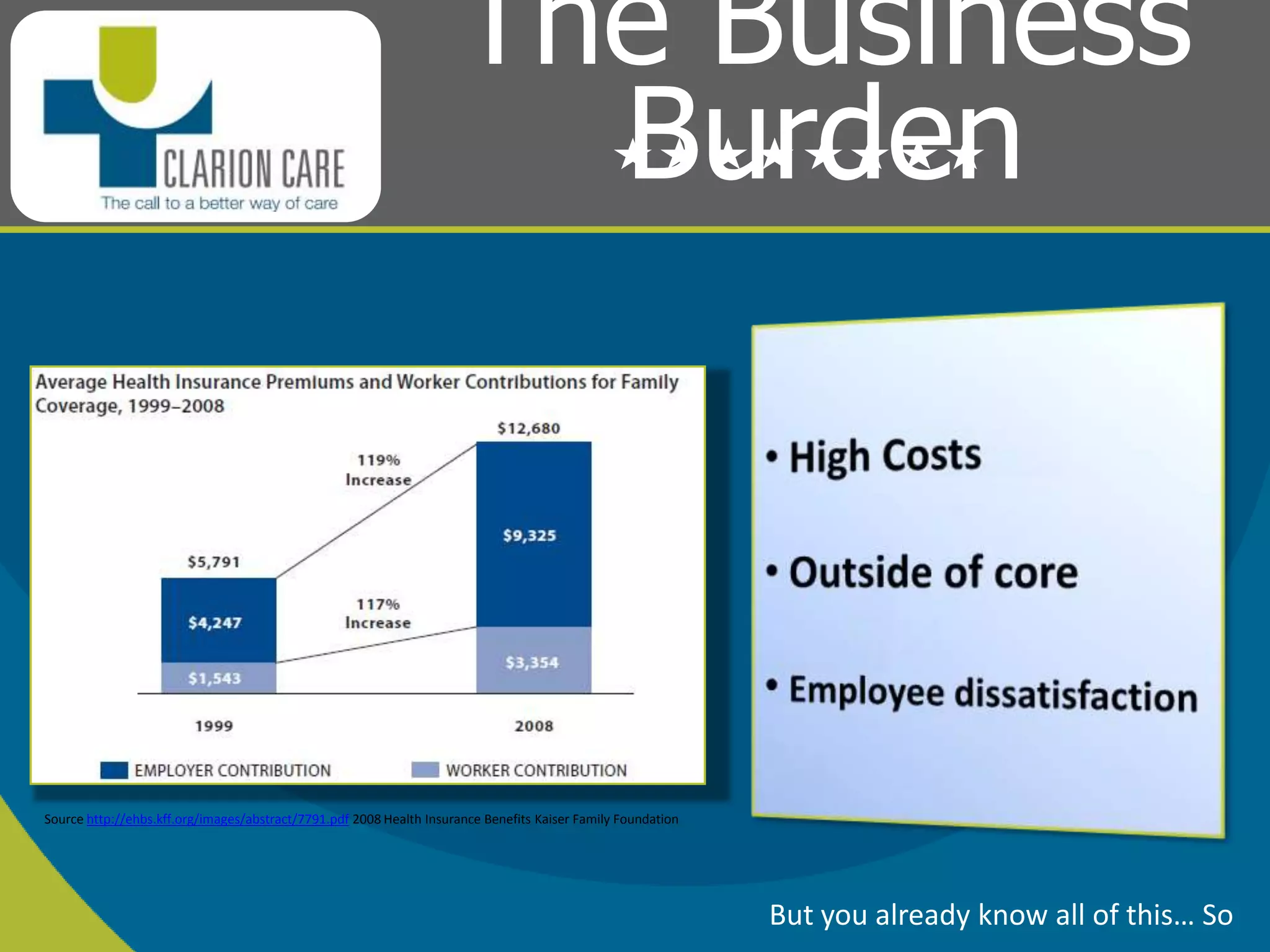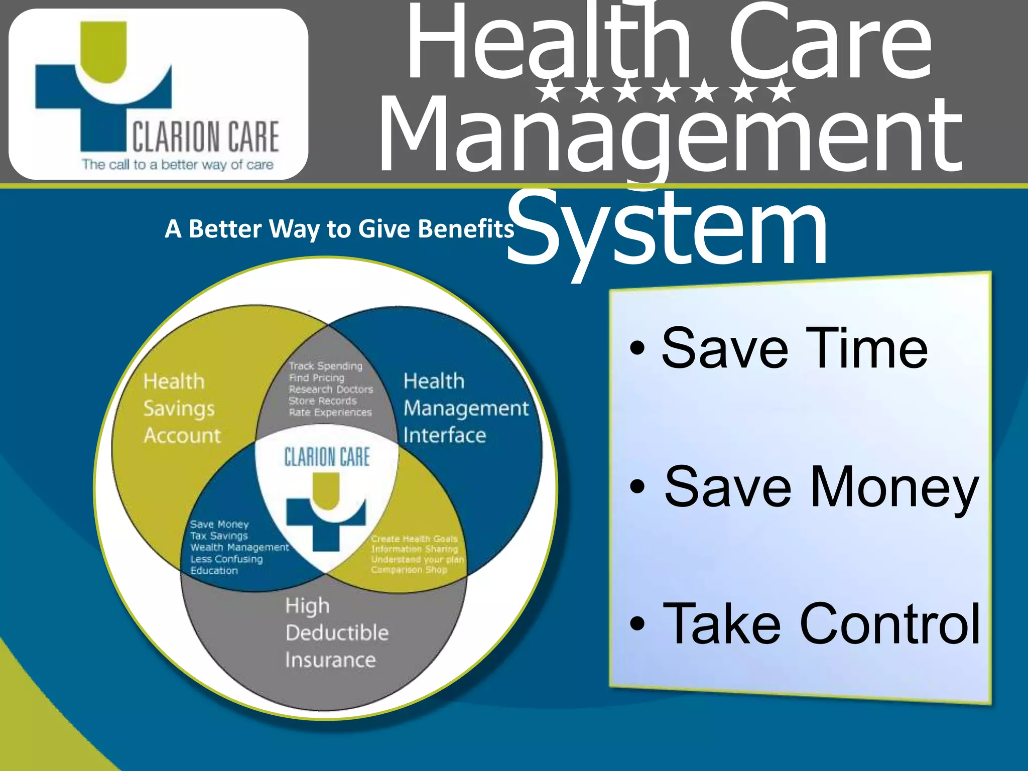 Clarion Care is a benefits administration platform that aims to save employers and employees time and money on healthcare costs. It allows employers to make a single monthly payment into employee Clarion Care accounts, giving employees tax-free money to purchase qualified health insurance and pay medical expenses. On average, employers can save over $9300 per employee annually in healthcare costs by using Clarion Care. It streamlines benefits administration and gives employees easy-to-use tools to manage their health spending and insurance choices.