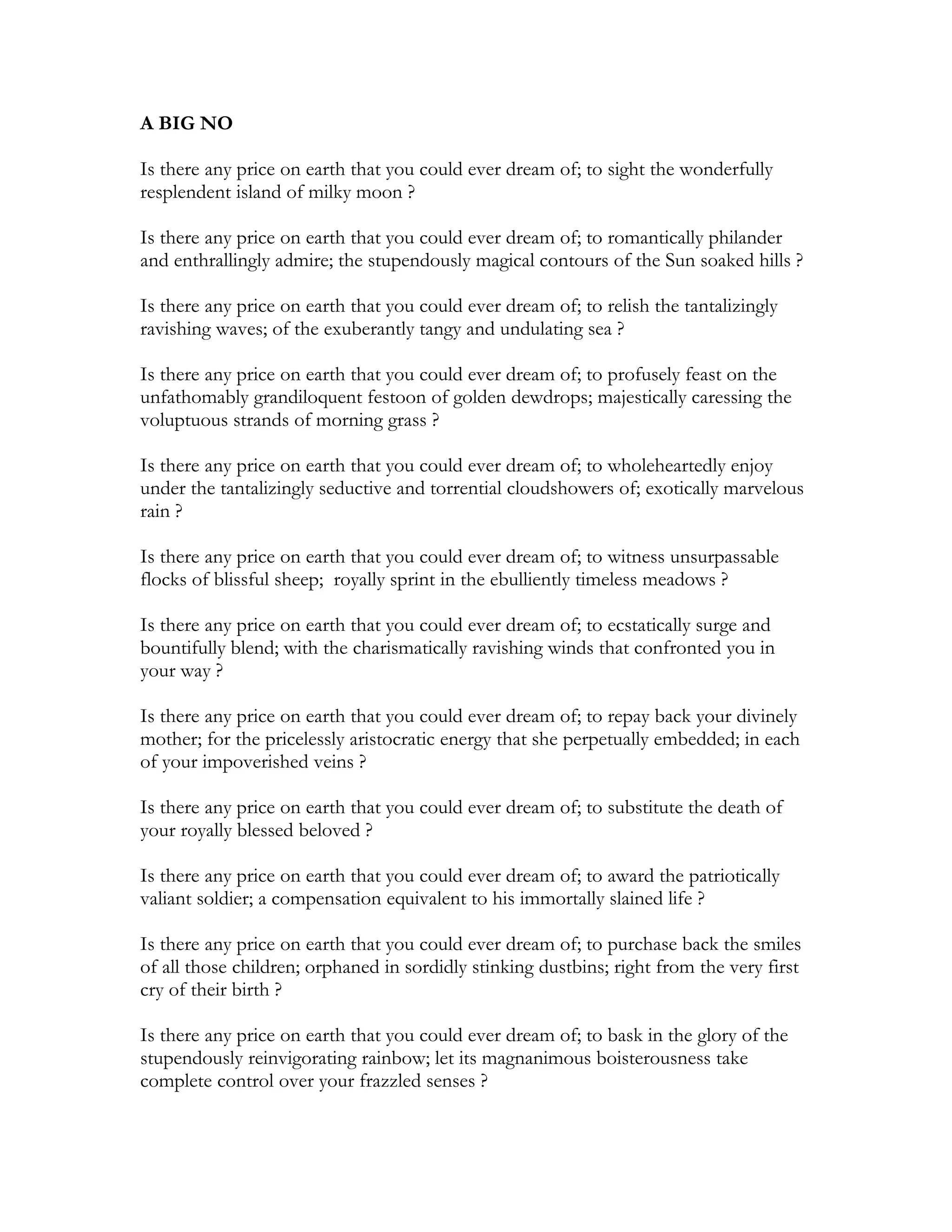 The document poses a series of rhetorical questions about whether there is a price that can be dreamed of to experience various wonders and positive experiences. It asks if there is a price to experience natural beauty, spend time with loved ones, help those in need, and experience love. In the end, it conveys that the Lord has said all such experiences are priceless and cannot be purchased, so the answer to all the questions is "a BIG NO."