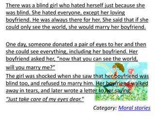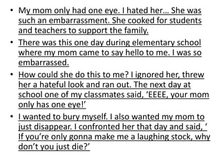 The boy was embarrassed by his mother who had only one eye and worked hard to support them. He was mean and resentful towards her. After growing up and having his own family, his mother came to visit but he was still ashamed and cruel to her. He later learns that she had given him her eye when he was young so he wouldn't have to grow up with only one eye. Overcome with guilt and remorse for his actions, he realizes how much his mother had sacrificed and loved him.
