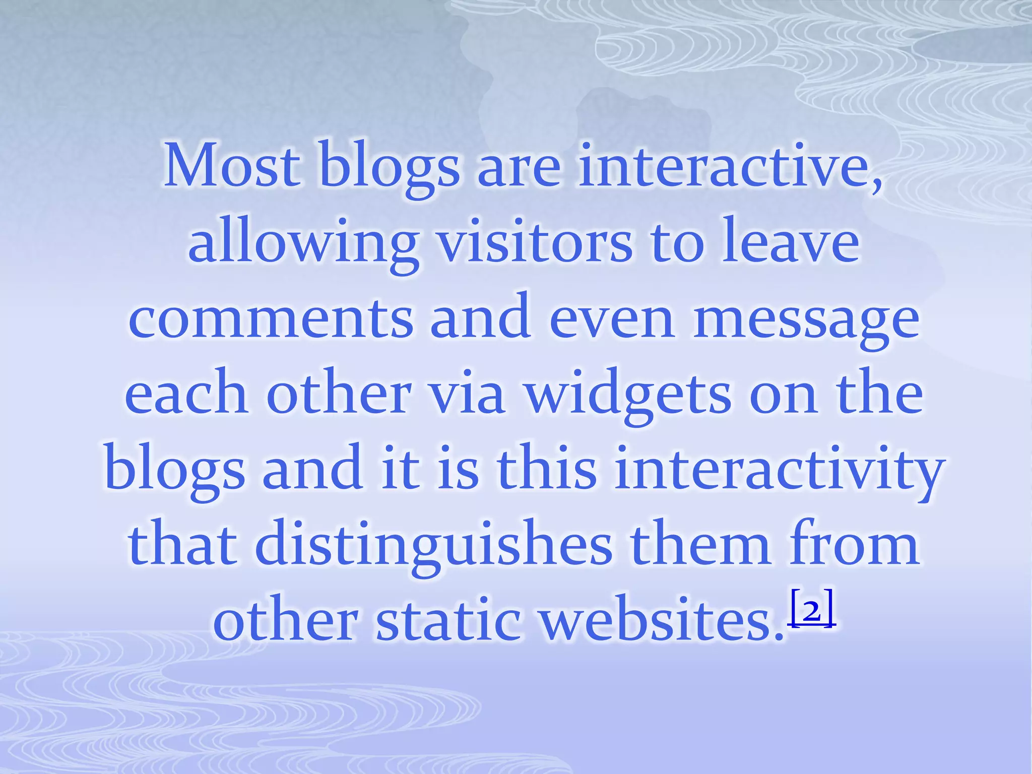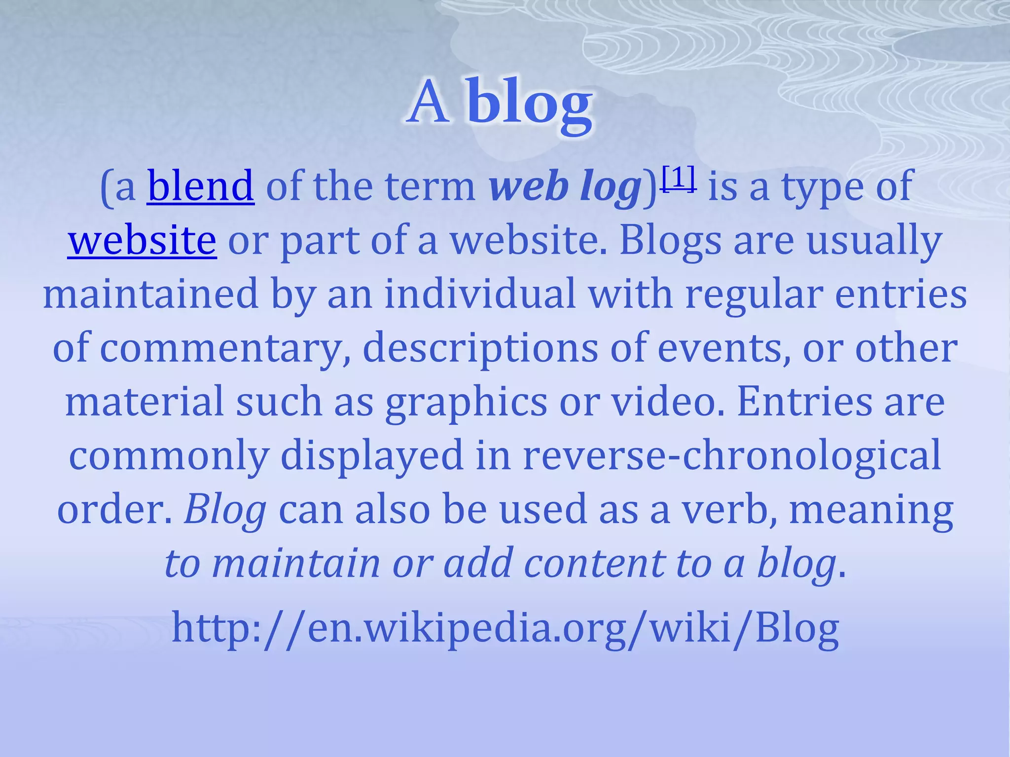 A blog is a type of website where entries are displayed in reverse-chronological order. Blogs allow visitors to leave comments and interact with each other. Most blogs provide commentary or news on a particular topic, though some function as personal online diaries. Early blogs evolved from online diaries where people documented their personal lives, and tools were developed to facilitate blog publication and maintenance, leading to the modern concept of blogging.