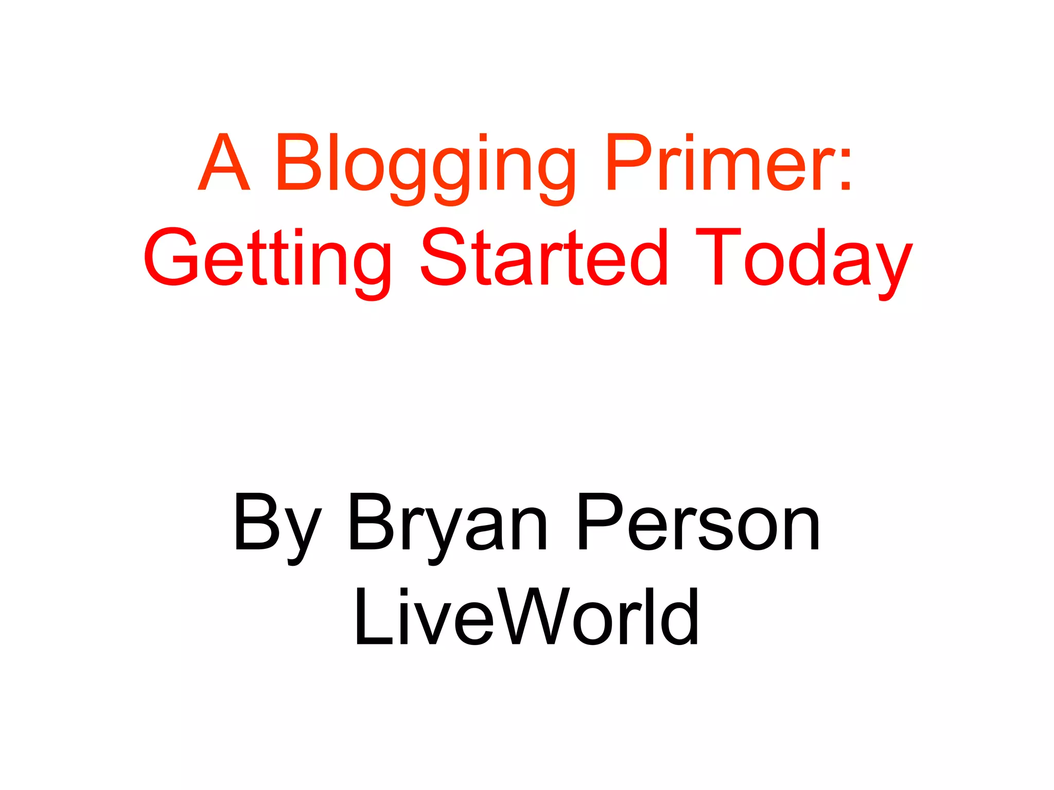 The document is a blogging primer by Bryan Person, providing guidance on starting and maintaining a blog. Key points include creating compelling content, promoting blog visibility, and measuring success through various metrics. It emphasizes originality, engagement with the audience, and building community through links and transparency.