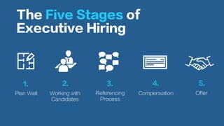 This document outlines the five stages of executive hiring: 1) Planning, 2) Working with Candidates, 3) Referencing Process, 4) Compensation Offer, and 5) Offer. It provides tips for each stage, such as developing a prioritized hiring list, taking control of the candidate process, conducting a "mini board meeting" for candidates to present their strategy, doing a 360 degree reference check process, addressing compensation expectations, and making the final offer only when confident it will be accepted. The overall goal is to eliminate surprises after the new executive is hired.