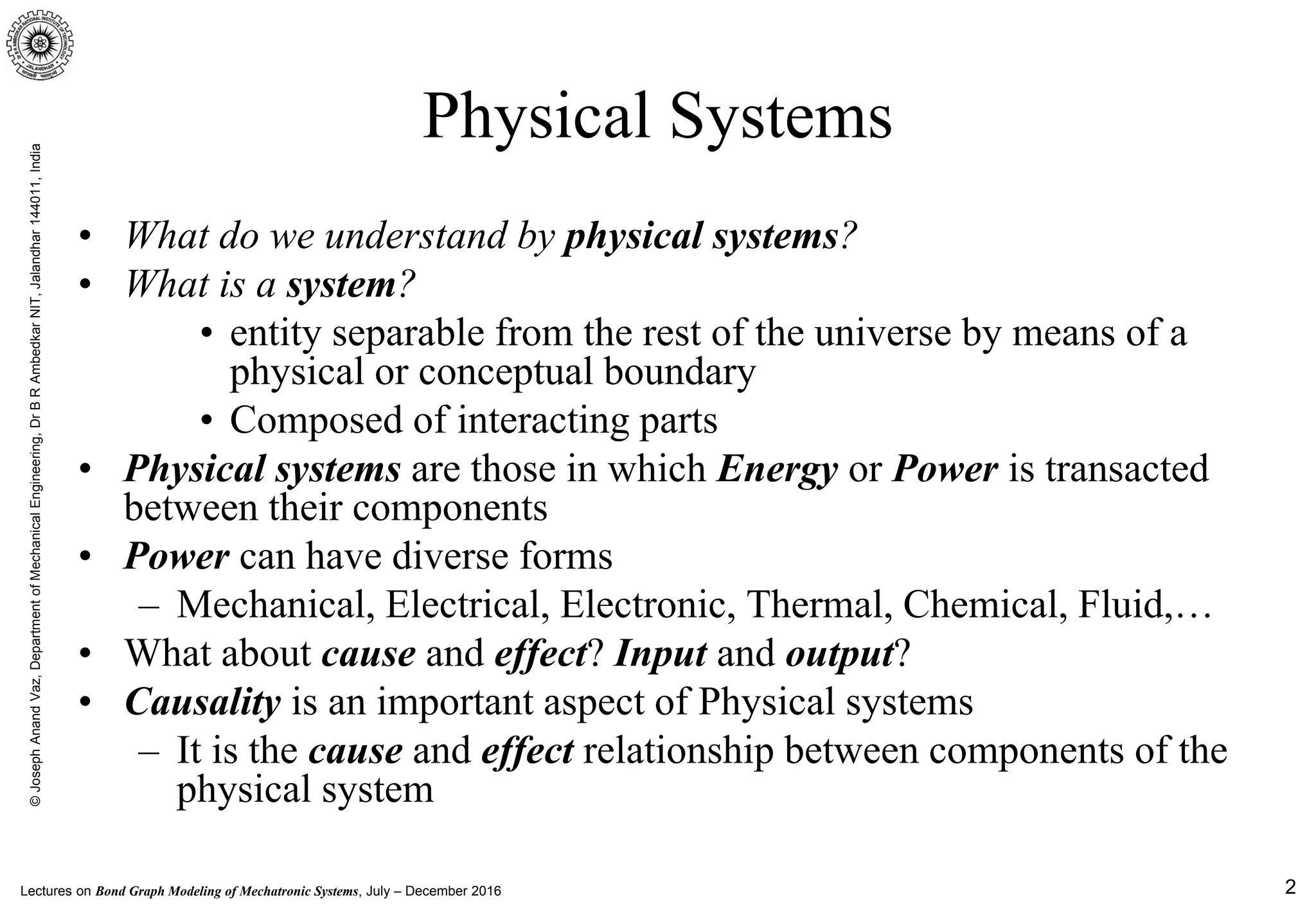 This document provides an introduction to modeling physical systems using bond graphs. It discusses physical systems and why modeling them is important. It then introduces bond graphs as a unified approach to modeling the dynamics of multi-domain physical systems using graphical elements. The key concepts of bond graphs like power bonds, effort/flow variables, elements, causality and junctions are explained. Examples of simple mechanical and electrical systems are modeled using bond graphs. The document emphasizes that bond graphs can provide insight into system behavior and that system equations can be algorithmically derived from the bond graph model.