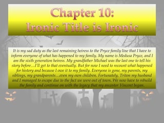 Medusa Pryce is the last remaining heir to the Pryce family line. Her entire family has been killed except for her husband Triton. She recounts the history of her family, including her alien father and mermaid mother. Her family lived in Dragon Valley until her witch grandfather was killed by a meteor. Grim foretold three blows would befall the family. Medusa and Triton had five children through the use of a time machine, but all of their children were killed along with the rest of the family. Only Medusa and Triton survived and have lost their supernatural abilities. Medusa is determined to continue the family legacy and rebuild her resort empire in Isla Paradiso despite their losses.
