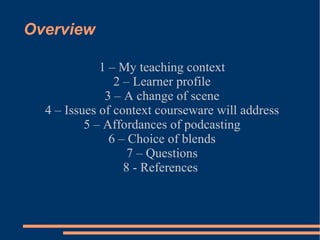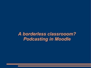 This document discusses using podcasting in an English language classroom on Moodle. It provides context about the teaching environment, learners, and upcoming changes. Podcasting could address issues like motivation, assessment preparation, and providing further practice. The author chooses PodOmatic for its ease of use and embedding in Moodle. Questions are raised about how podcasting may impact language learning. References on using podcasting for language acquisition are provided.
