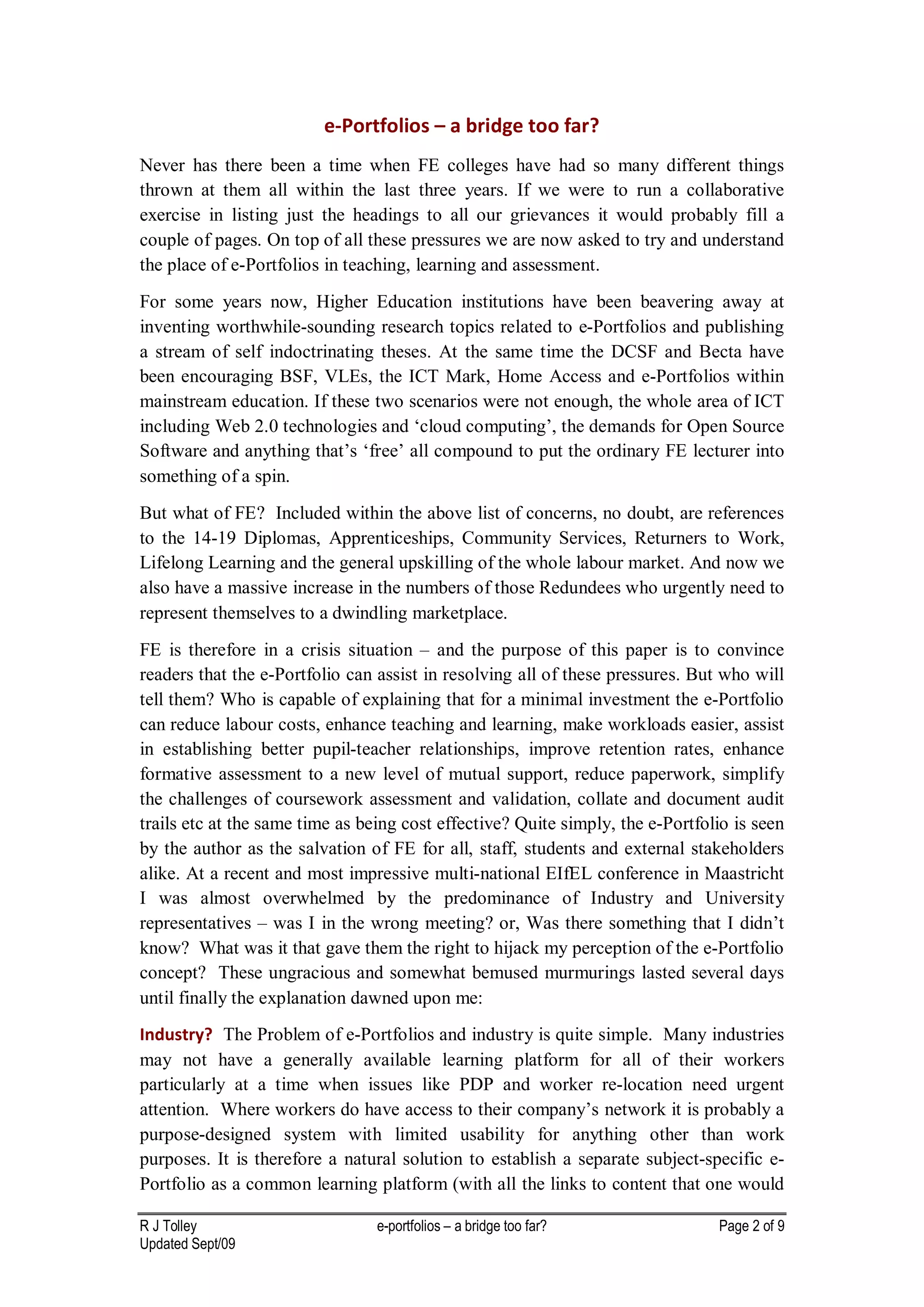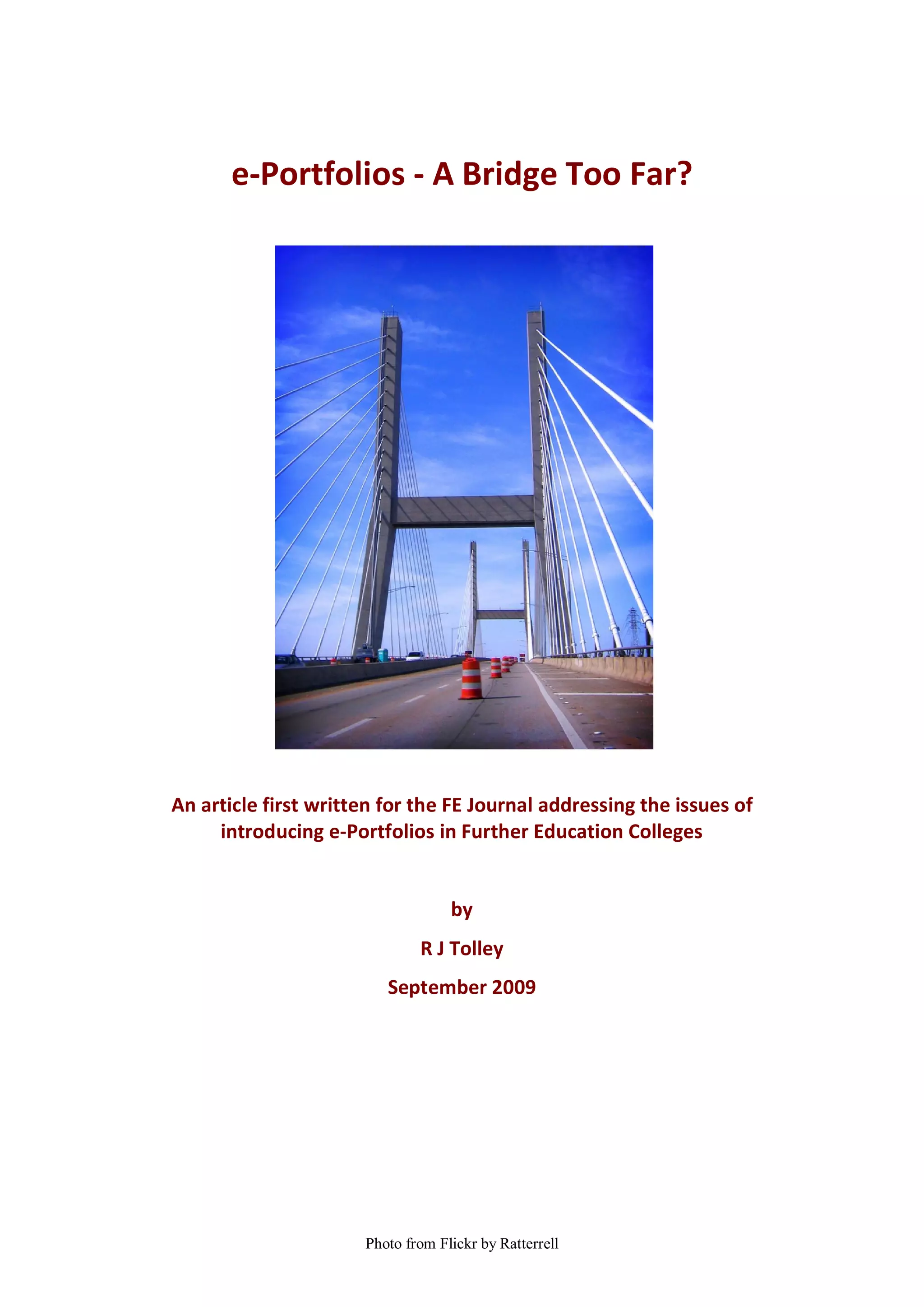 The document discusses the introduction of e-portfolios in further education (FE) colleges, emphasizing their potential to alleviate various challenges faced by educators and students. It argues that e-portfolios can enhance learning, reduce administrative burdens, and improve student-teacher relationships while calling for a collaborative effort among college staff for successful implementation. The author envisions e-portfolios as lifelong tools for students to showcase achievements and manage their educational journeys, despite existing concerns about their format and integration in current educational systems.