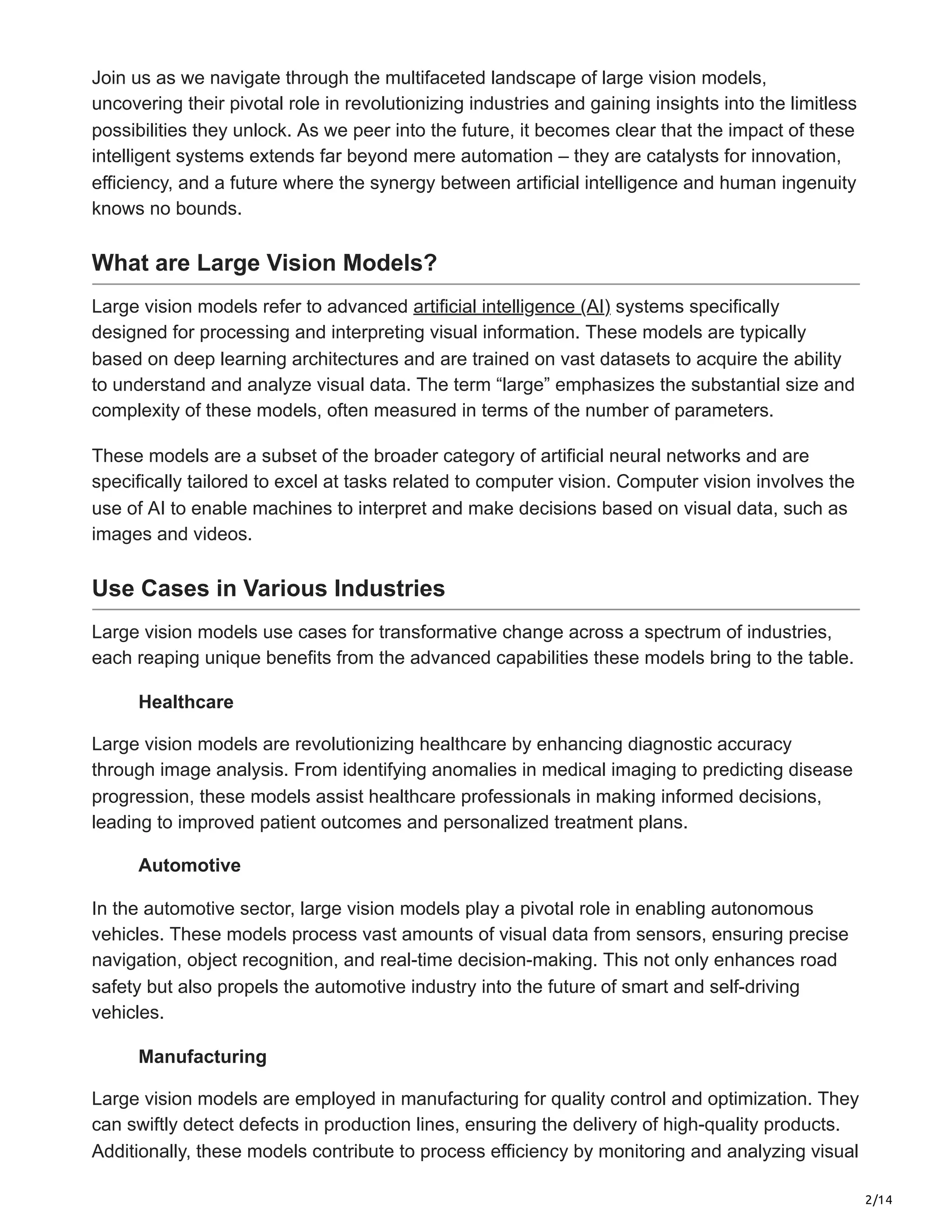 Large vision models represent advanced AI systems designed for processing and interpreting visual data, significantly impacting various industries such as healthcare, automotive, manufacturing, and entertainment. These models excel in tasks such as image recognition, object detection, and image captioning, driving efficiency, innovation, and accuracy in decision-making. Despite their transformative potential, challenges such as high computational demands, data privacy concerns, and bias mitigation remain critical for the responsible development and deployment of these technologies.